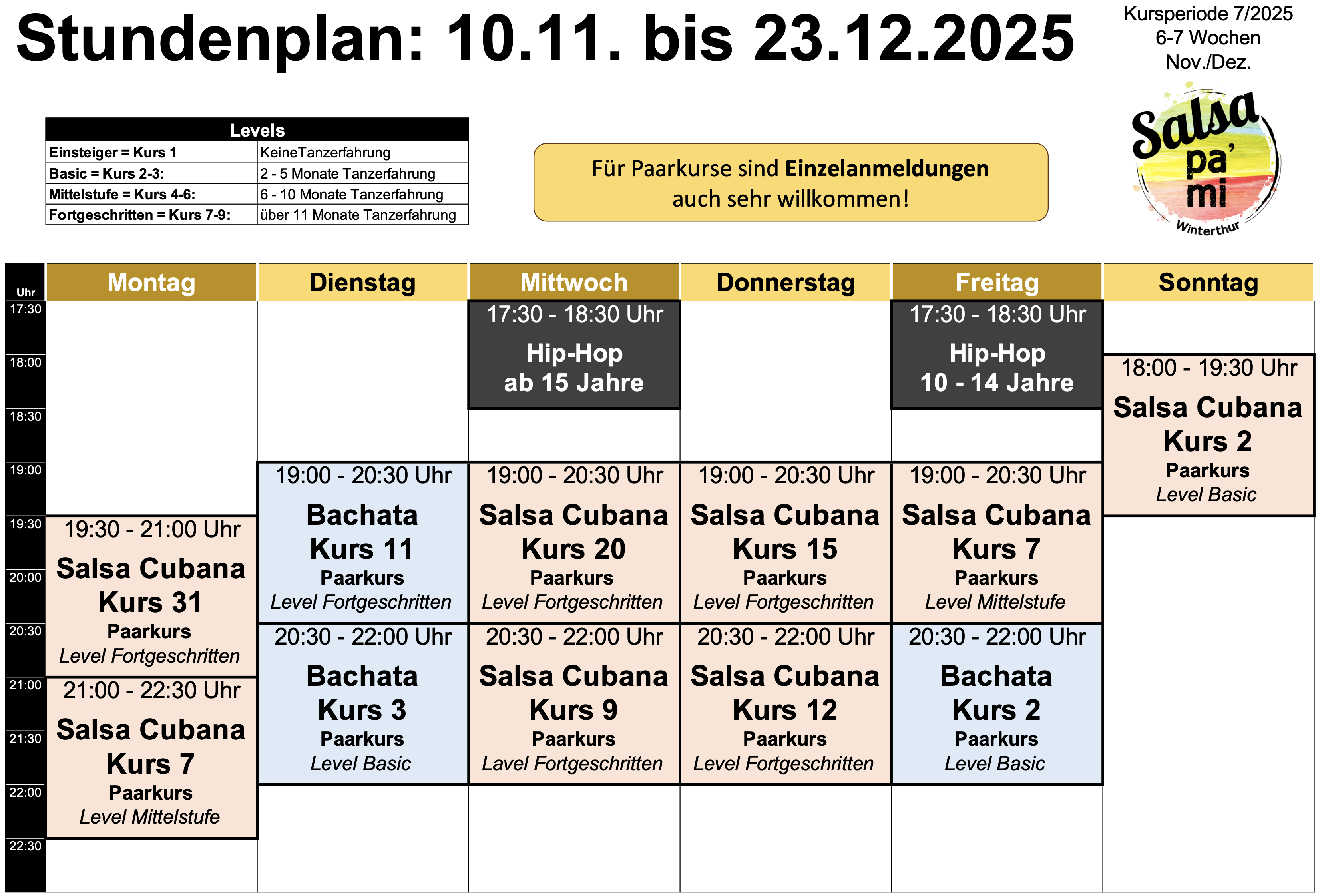 Wenn du zum Beispiel einen Salsakurs mit Kurslevel 6 gebucht hast, dann kannst du alle Salsakurse mit den Levels 1-6 besuchen (Bachata- oder Solokurse sind jedoch ausgeschlossen).