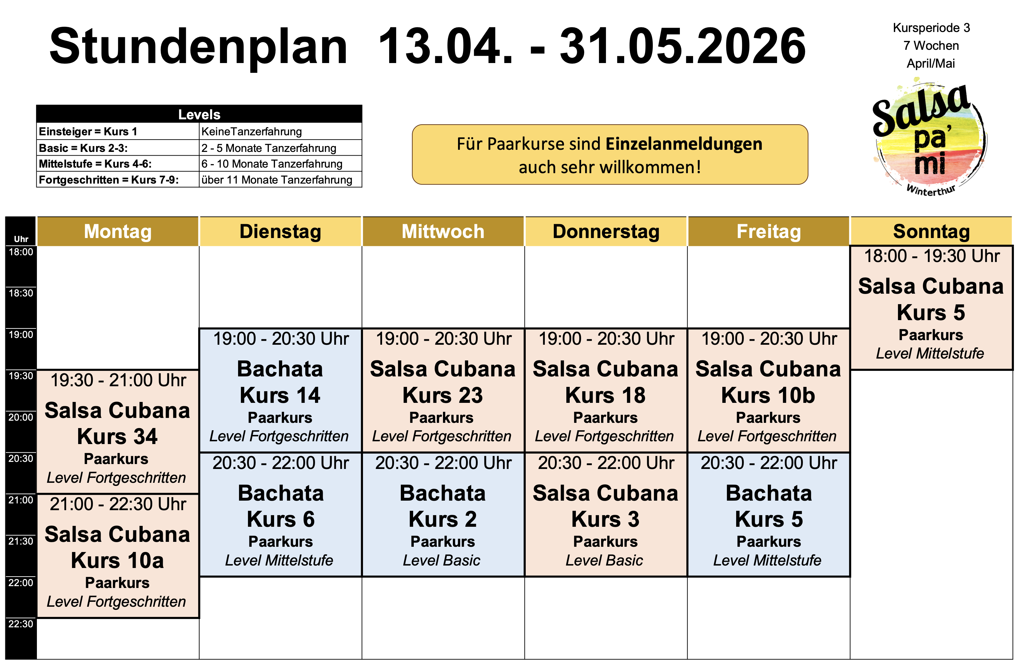 Wenn du zum Beispiel einen Salsakurs mit Kurslevel 6 gebucht hast, dann kannst du alle Salsakurse mit den Levels 1-6 besuchen (Bachata- oder Solokurse sind jedoch ausgeschlossen).